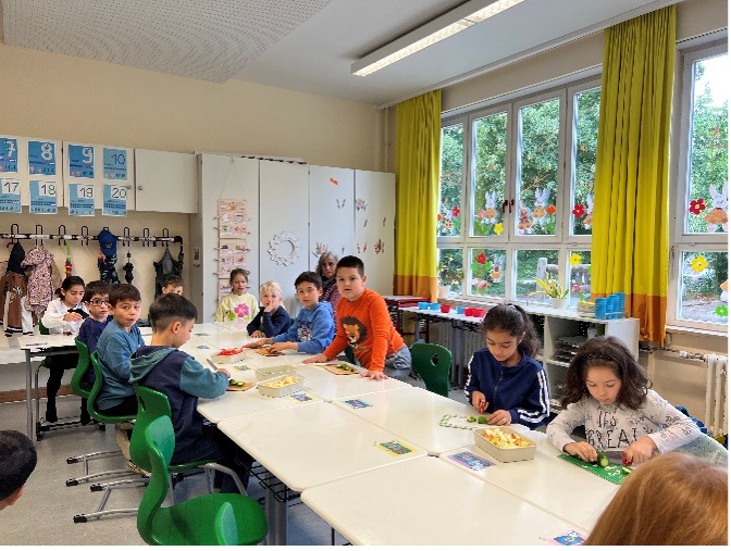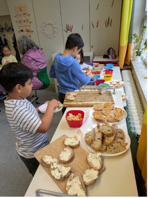 Es gab viel Obst und Gemüse, das kleingeschnitten und angerichtet werden musste. Einige Kinder beschmierten Brote mit Käse und Erdnussbutter.