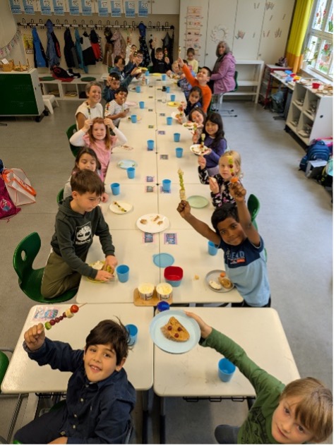 Zum Schluss konnten sich alle am Buffet bedienen. Die leckeren Brotgesichter sowie Obst- und Gemüsespieße schmeckten den Kindern richtig! Ebenso genossen die Kinder selbstgemachte Limonade.