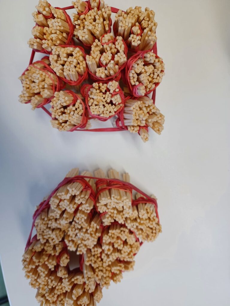 Zu Beginn durften wir schätzen, wie viele Streichhölzer sich in zwei großen Tüten befinden. Anschließend haben wir die Streichhölzer sorgfältig gezählt. Jede Gruppe entwickelte dabei ihre eigene Zählstrategie. Am einfachsten war es, zunächst Zehner zu bündeln, anschließend 10 Zehner mit einem Gummi zu einem Hunderter zusammenzufassen und schließlich 10 Hunderter zu einem Tausender zu bündeln.