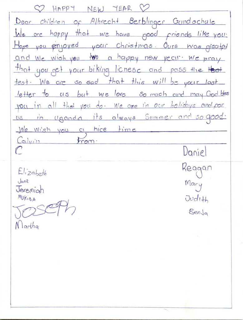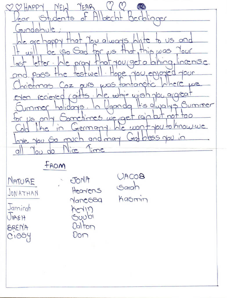 Seit mehreren Jahren pflegen unsere SchülerInnen einen Brieffreundschaft mit den Kindern aus unserem Spendenprojekt in Uganda. Auch heute haben uns wieder tolle Briefe erreicht, denen wir natürlich antworten werden.